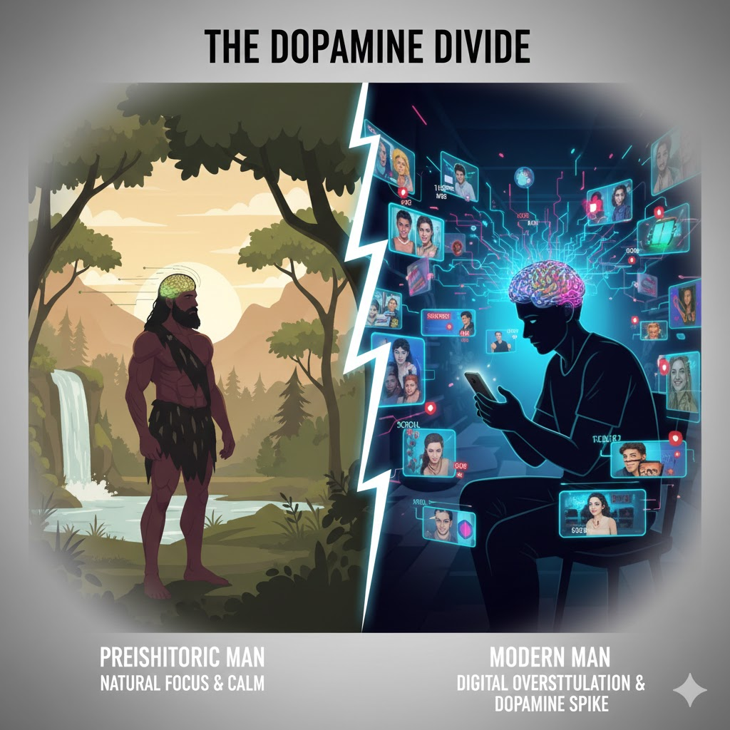 Comparación entre el cerebro prehistórico y el cerebro moderno afectado por redes sociales.