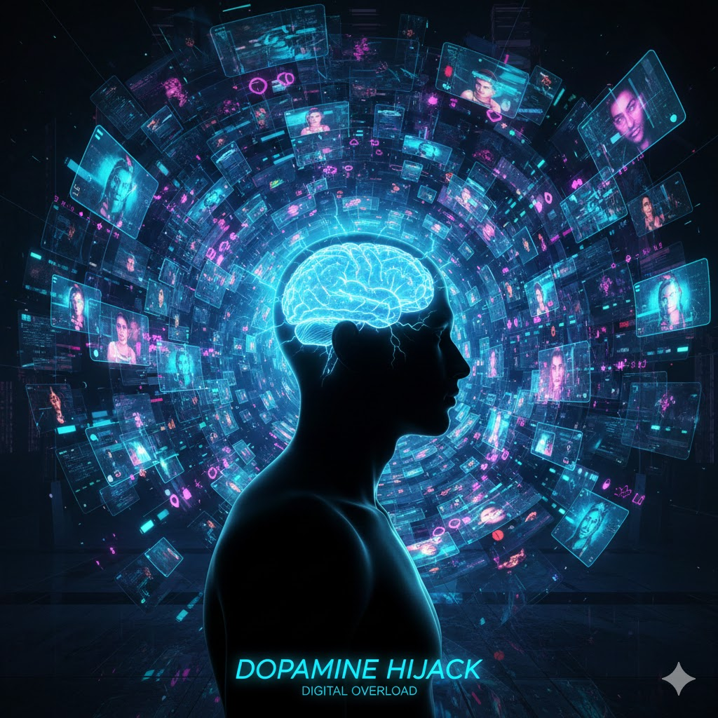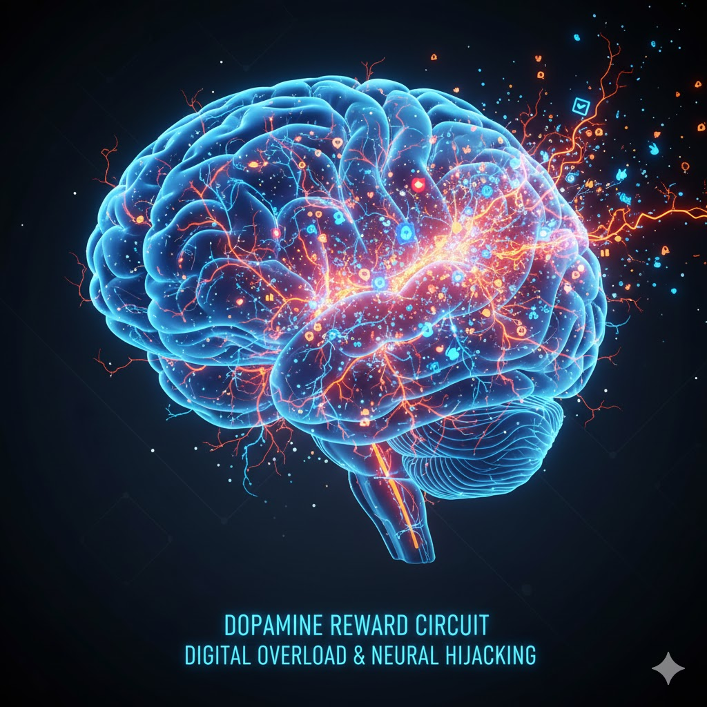 Ilustración del sistema dopaminérgico sobreestimulado por contenido digital.