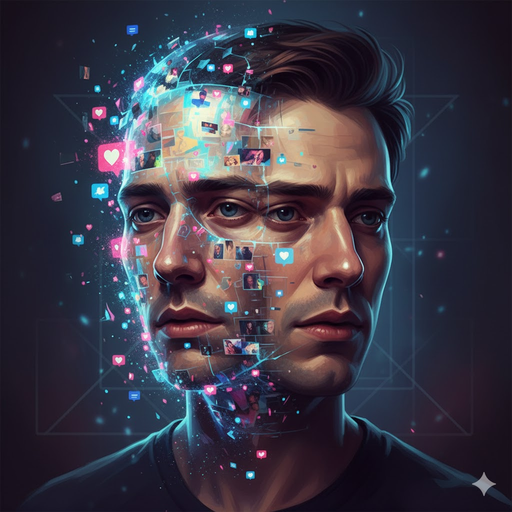 Hombre experimentando disociación por consumo excesivo de belleza digital
